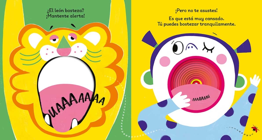 Todos cierran los ojos y abren la boca de par en par sin poder evitarlo. El bostezo anuncia que es casi la hora… ¿La hora de qué?, preguntan los animales. Una mariquita que ha cruzado discretamente las páginas responde: ¡Shhh!