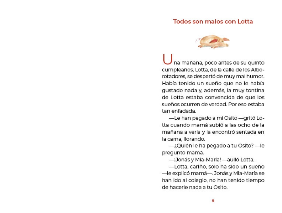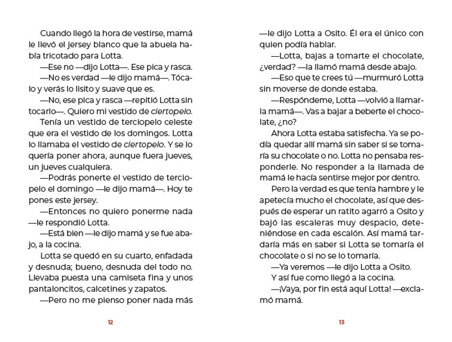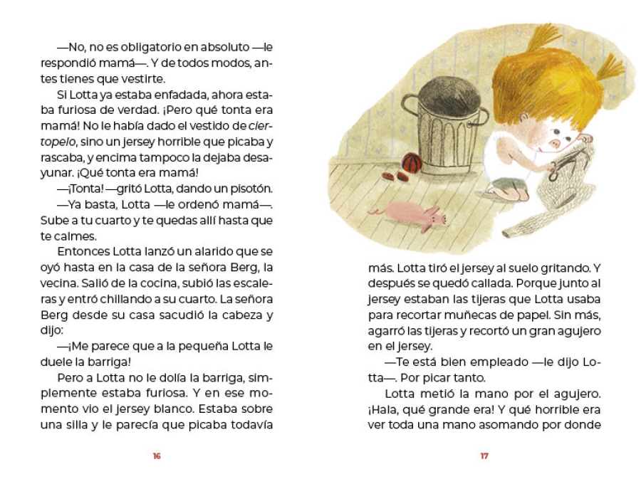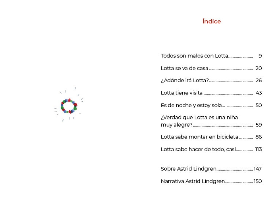 Lotta aún no ha cumplido los cinco años y ya casi sabe hacer de todo. Se viste sola, sabe silbar, va sola a comprar caramelos y aprende sola a montar en bicicleta, aunque todavía no tenga una. Pero, sobre todo, no hay quien la iguale a la hora de inventar las ideas más disparatadas y divertidas del mundo y de resolver problemas terribles, como la repentina desaparición de los árboles de Navidad de las tiendas o la gravísima escasez de golosinas. Y no solo eso: Lotta es también la niña más alegre de toda la calle de los Alborotadores, a menos que, claro, esté enfadada en ese momento.Este es el segundo volumen de los dos que escribió Astrid Lindgren de Lotta, uno de sus personajes más queridos.